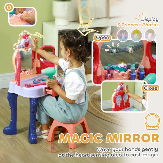 Kids Vanity Set with Mirror and Stool, Music, Light, Drawer, Hair Dryer, 20 Makeup Accessories, Multicolor
