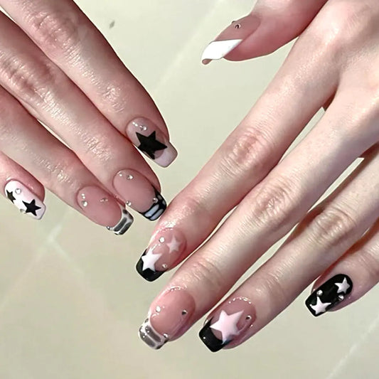 Short Star Press on Nails SquareFrench Fake Nails with RhinestonesShiny Stars Designs Nude False Nails Full Cover Stick on Nails Accessories Press on Nails for Women24Pcs