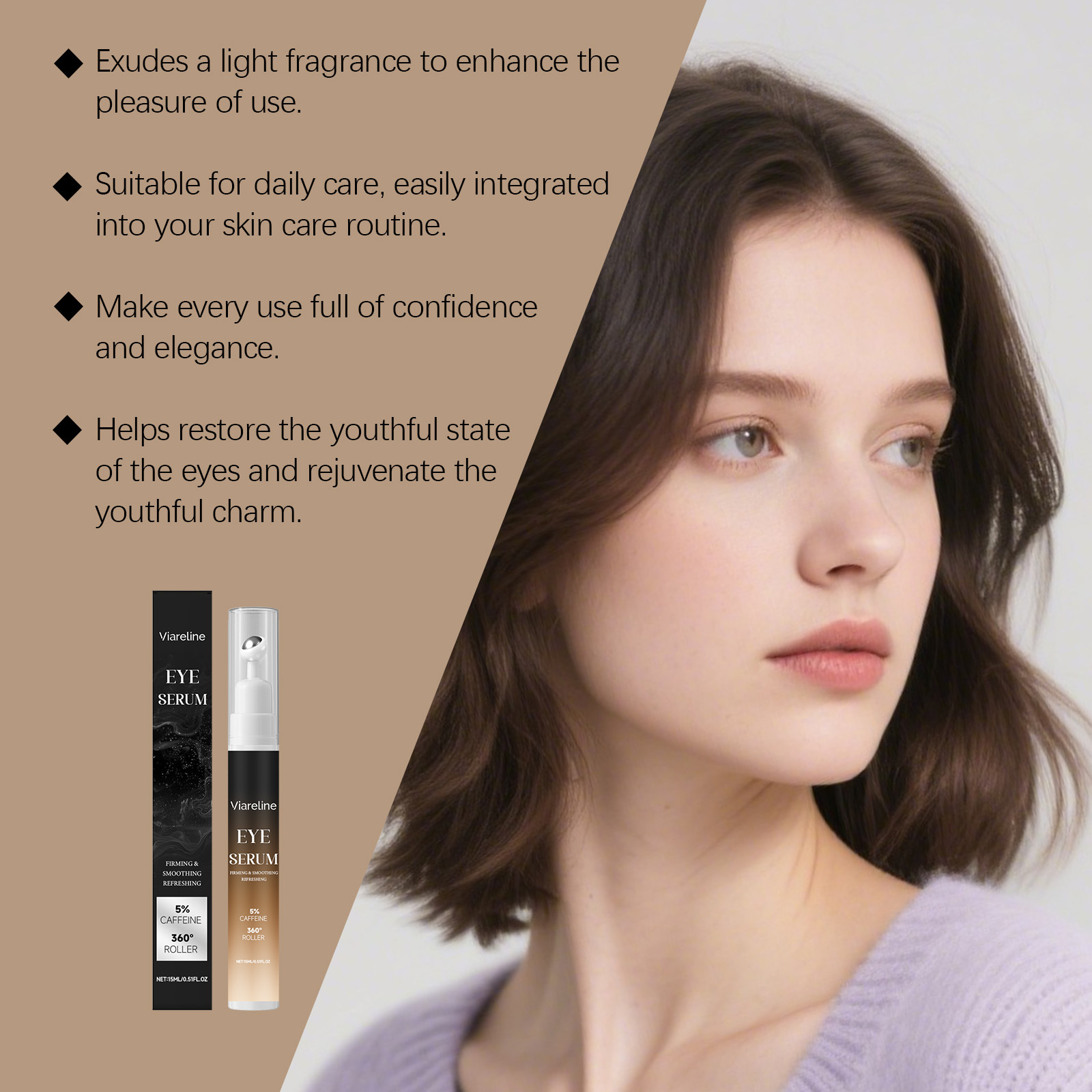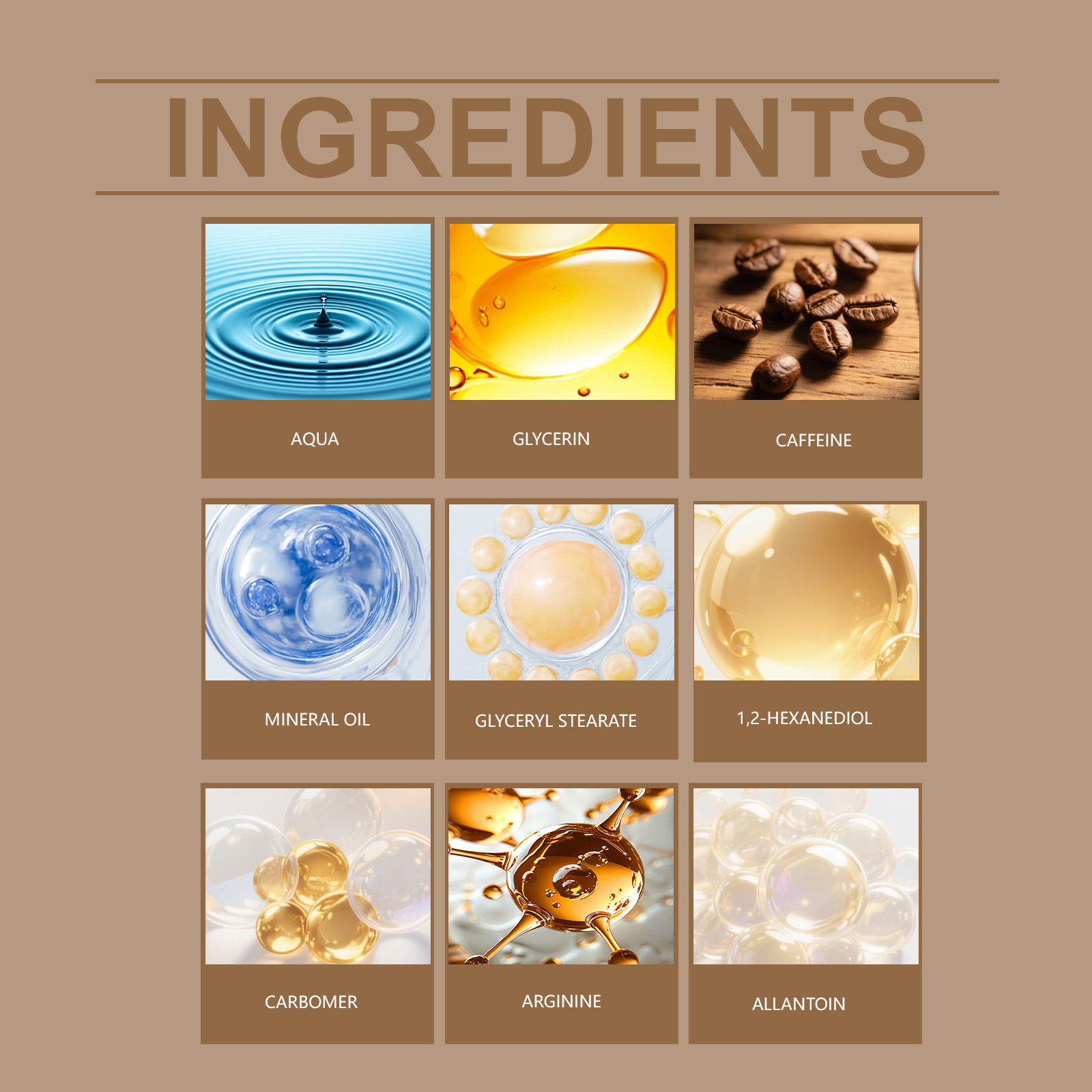 Ingredients: water, glycerin, caffeine, mineral oil, glycerol stearate, 1,2- hexanediol, carbomer, arginine, allantoin.