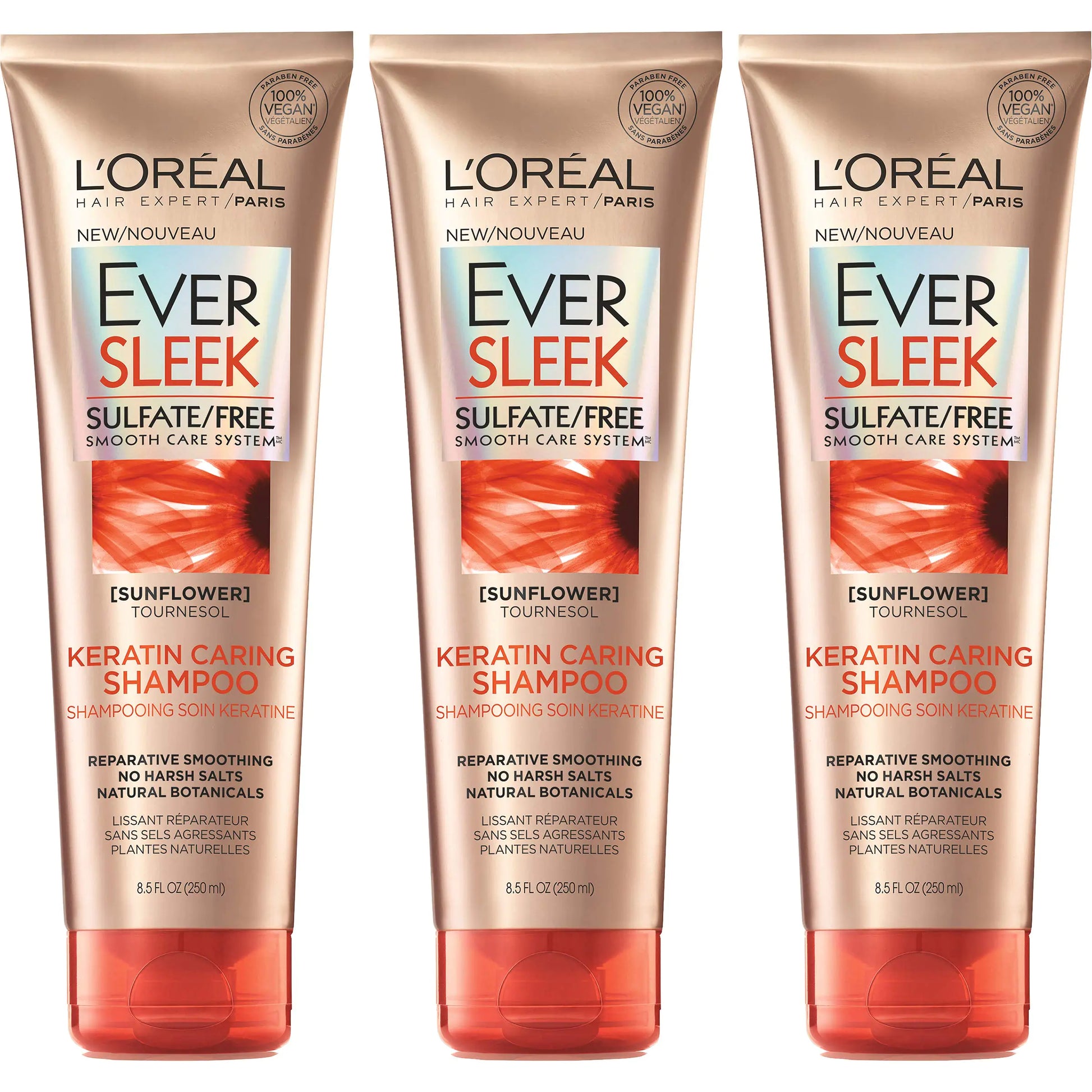 LOreal EverSleek Keratin Caring sulfate free shampoo with sunflower oil for chemically straightened hair cleanses and cares for the essential protein and keratin found in hair. Repairs smooths and improves hair texture. Our smoothing shampoo is silicone free and is especially gentle on keratin and color treated hair. There are no harsh sulfates salts or surfactants that can strip dull and damage hair. Experience a purely sensorial lush luxurious lather and a fresh aromatic fragrance that blooms.