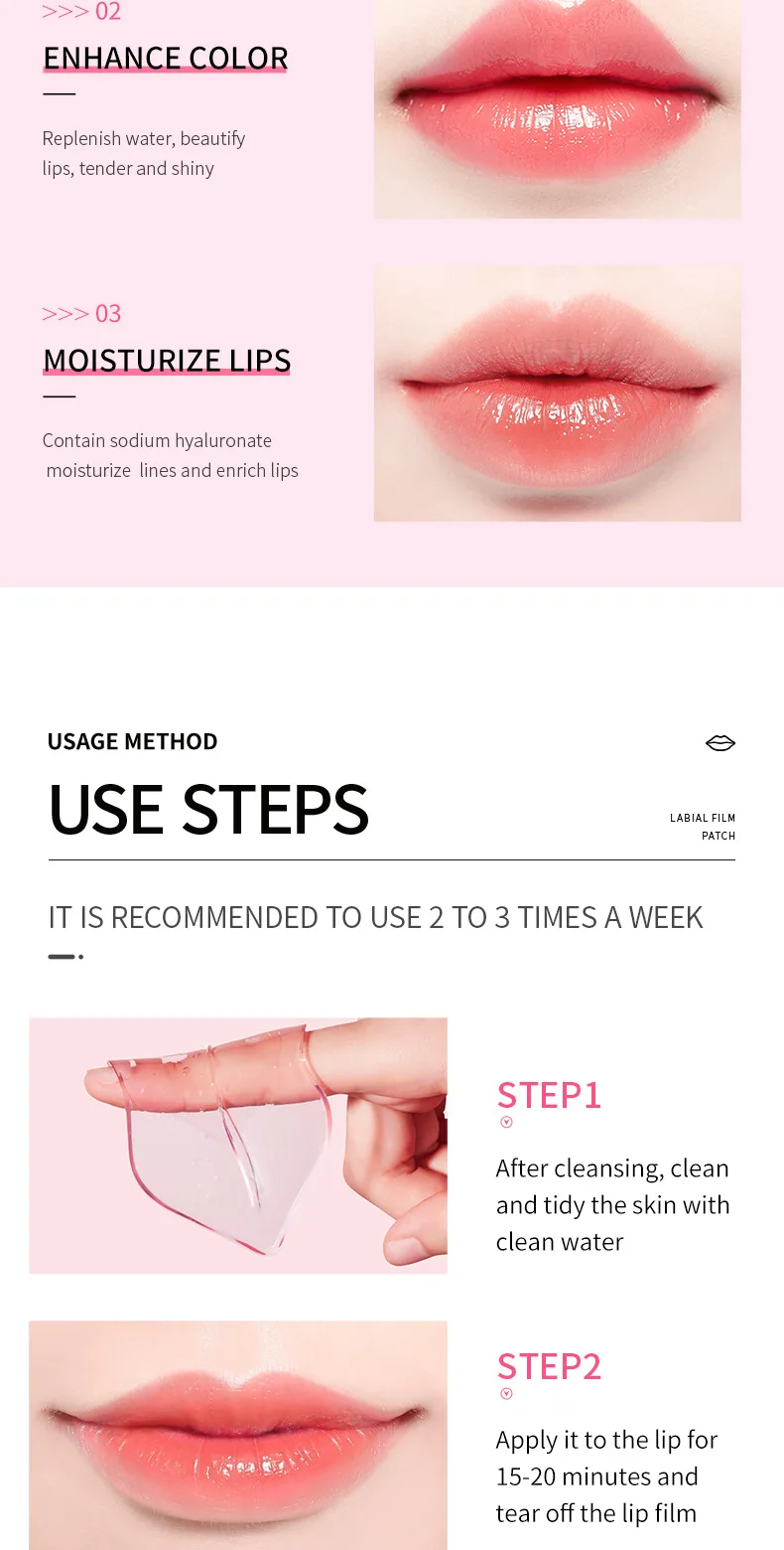 2.Place the collagen lip mask on the lip,and gently tap, let lip maks tightly attached on the lip.